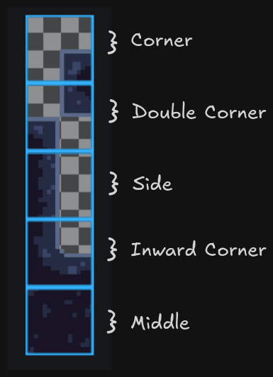Since we are painting visuals by their corners, we can reuse textures to compose other variants by rotating them in editor or in the placement script. This means we only need: a corner, a side, opposing corners, inwards corner, and a full / middle piece - 5 tiles.