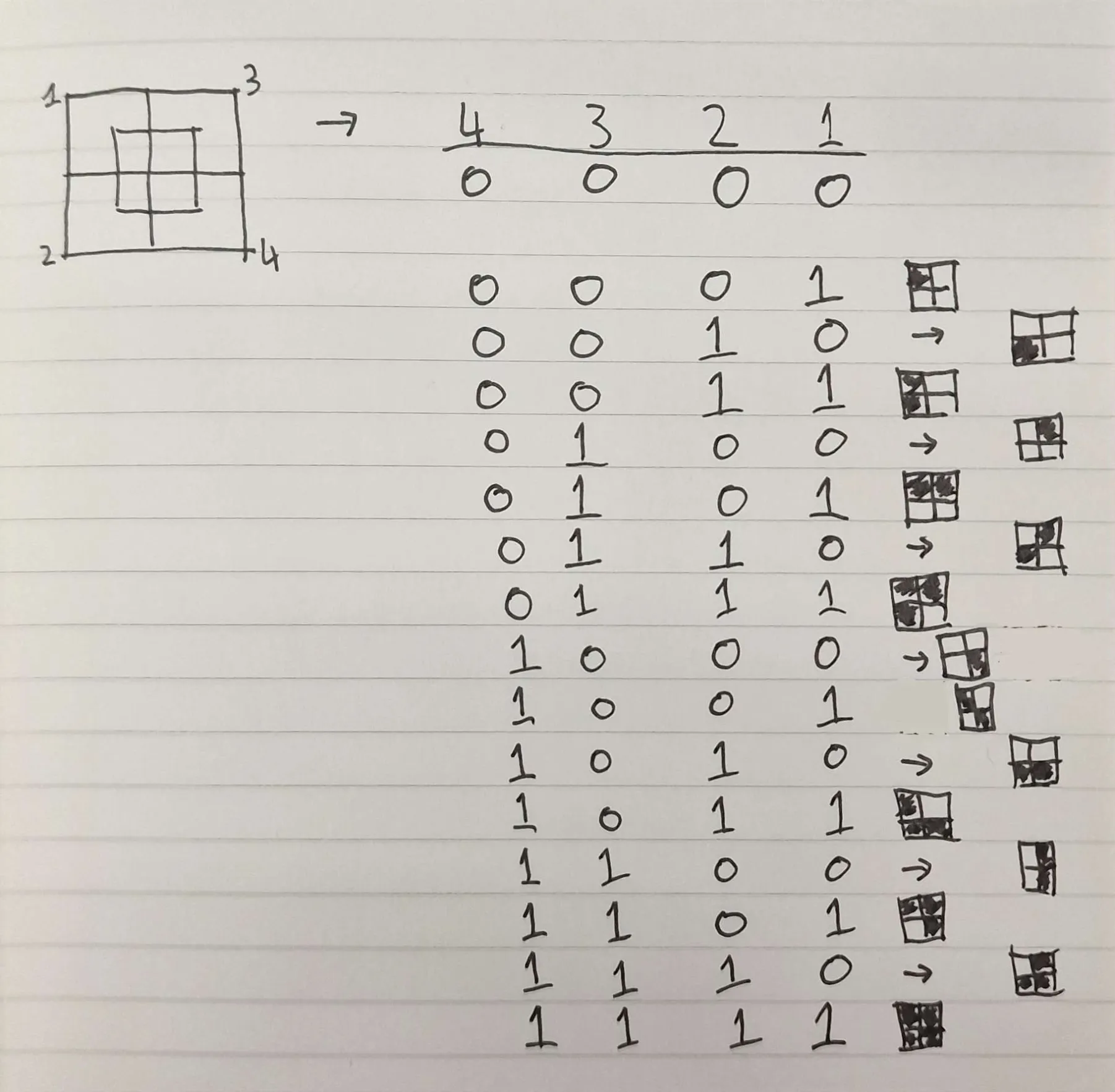 This gives each tile 4 neighbouring tiles between the other tilemap or just 16 permutations. We can represent this as a 4-bit mask and map each permutation to a visual placement.