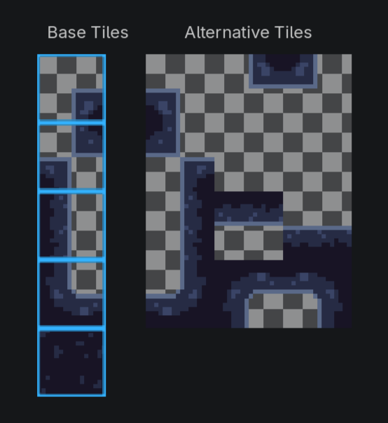 From these 5 tiles, we can rotate or flip the tile programmatically, as needed, to create the 16 different tile pieces. I store the 16 pieces in an array which is accessed by index corresponding to the binary value of the bitmask - it is important to setup your array in this order. In Godot, we can create alternative tiles directly in the editor and they are given coordinates in the texture atlas so we can simply store the coordinates. For other implementations, you may want to store the tile atlas coordinate + rotation instructions.